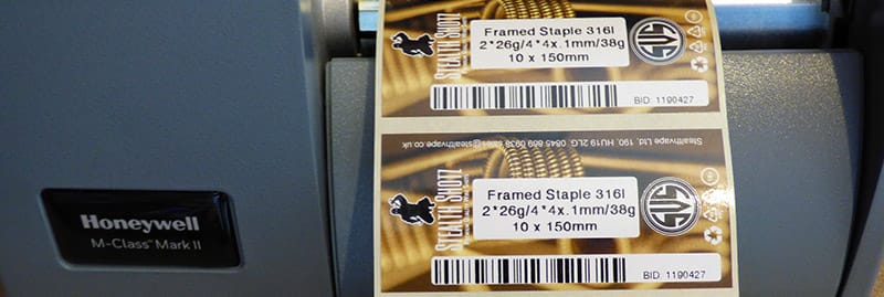 We’re printing our new labels with a pair of industrial Honeywell Datamax M-Class 4206 Mk II thermal transfer printers. The label stock we use is CMYK pre printed labels that are custom made for us by a leading commercial printers.